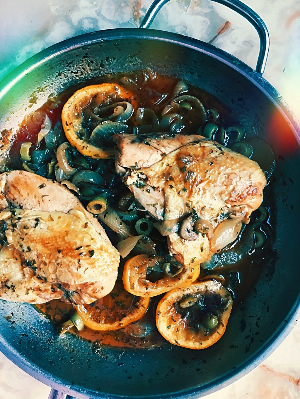 warm oil in skillet on medium heat. Wash lemon well, slice and place in pan until the edges become soft and a bit translucent (don’t cook too long or you will lose the pulp). Remove lemons to a dish. Place chicken into warmed skillet. Brown on both sides (8-10 minutes per side. You want the chicken a nice golden brown ). Remove chicken. Add onions to skillet and fry until translucent. They should brown with the chicken juices. If need more oil, add here.