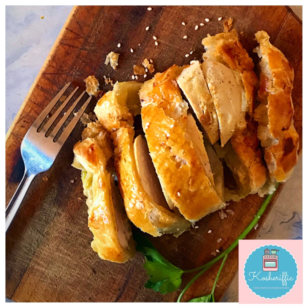 So I’ve been having trouble making the meals. I can’t stand for long periods of time etc. This week for Shabbos I came up with this recipe for phyllo schnitzel. I used to make this by cutting up the schnitzel into bite sized strips and then covering each strip with a piece of puff pastry (like wieners in a blanket) but today I just couldn’t. If you want something that presents well that you can serve on a tray, do it that way. This way worked well for me right now and took only 35 minutes to bake. Hope you enjoy it. The result looks awesome.