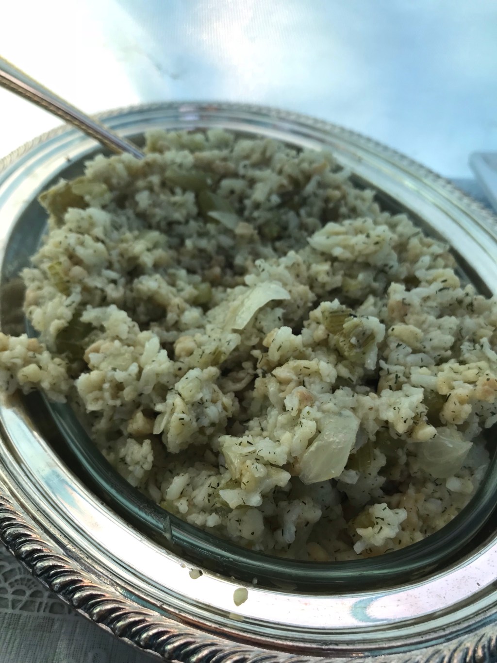 In a saucepan sauté onions and celery until the onions are golden and the celery soft (10 – 15 minutes). Add cup of precooked rice and bag of farfel. Add spices. Add 12 ounces of broth and boil for 20 minutes covered . Take off burner and let sit for 10 minutes. A savoury, quick side dish. (Note: I don’t always use the rice and will substitute a second bag of farfel!)