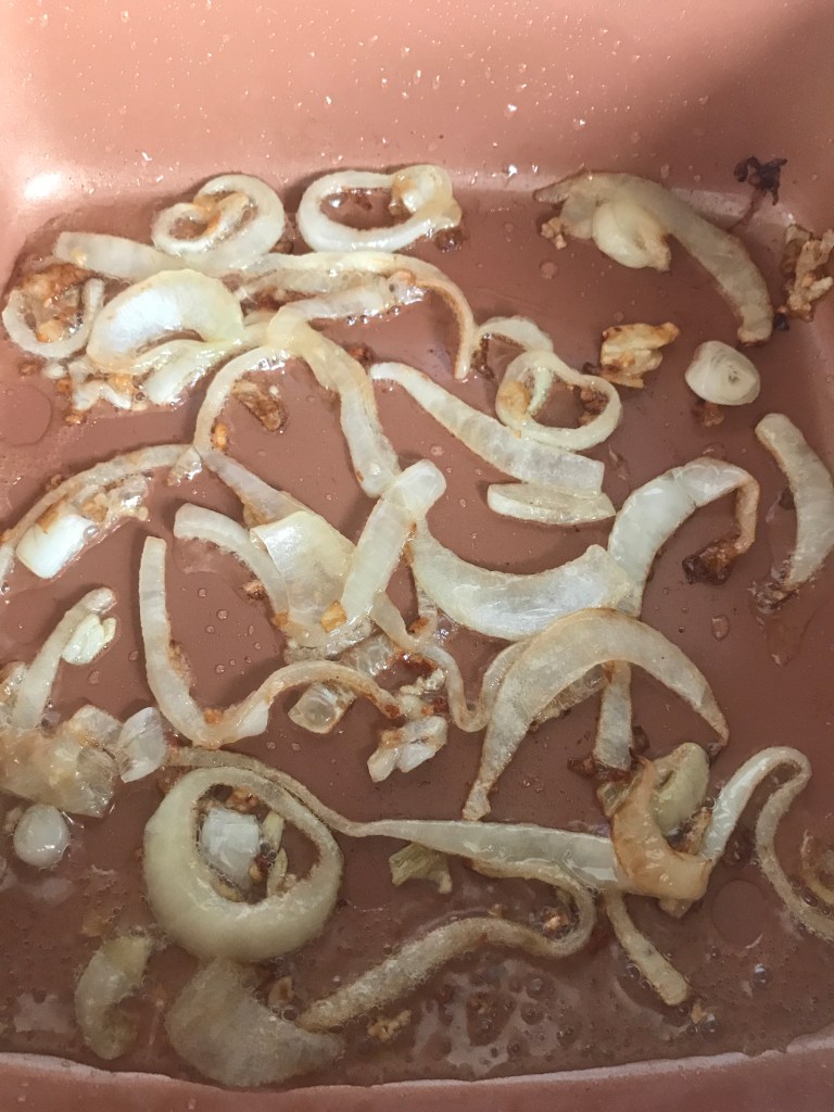 Place oil into skillet and add minced garlic with sliced onion. Sauté until slightly golden. Add chicken bottoms in, top down. Braise until skin is slightly brown, 3-5 minutes