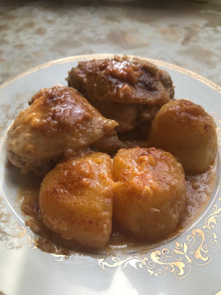 Turn over and do the same to bottom half. Sprinkle each thigh with sweet paprika (1 tsp per thigh). Drop potatoes into pan, keeping everything level. If food is doubled up, it won’t cook evenly. Add salt and pepper to mix. Add 2-3 cups water and cover. Turn down flame, cover and simmer for 30 minutes. Take off cover and turn chicken pieces over so tops brown. Add 2 Tbsp flour, stir and simmer for extra 5 minutes until gravy forms. Cover potatoes and chicken with gravy and plate. Sprinkle with paprika before serving. This is basically more “brown food” but it’s soft and a great comfort food for those chilly fall nights.