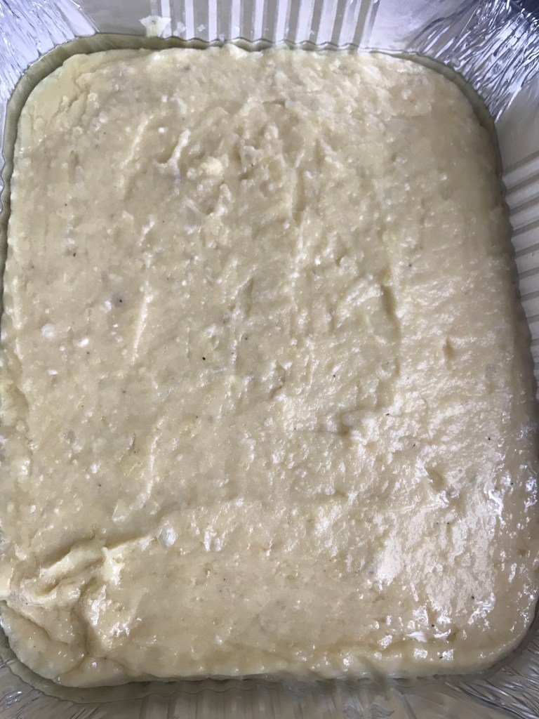 Peel and chop potatoes into quarters. Boil until soft. Drain water. Mash. Dice onion into fine pieces. Sauté in 1/2 cup oil. Add to potatoes. Add eggs, flour, baking powder and salt and pepper. Stir with strong spoon until smooth Pour into greased 9×11 pan. Smooth out. Top with egg wash and sprinkle with sesame seeds. Bake at 350F for 1 hour.
